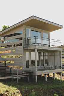 Мы советуем выбирать домик Лето для размещения с детьми. Он одноэтажный и у него есть площадка возле дома. У остальных домов есть нюансы (в двухэтажных домах не очень удобная для детей винтовая лестница, у Облака опасная веранда, а домик Море маленький)